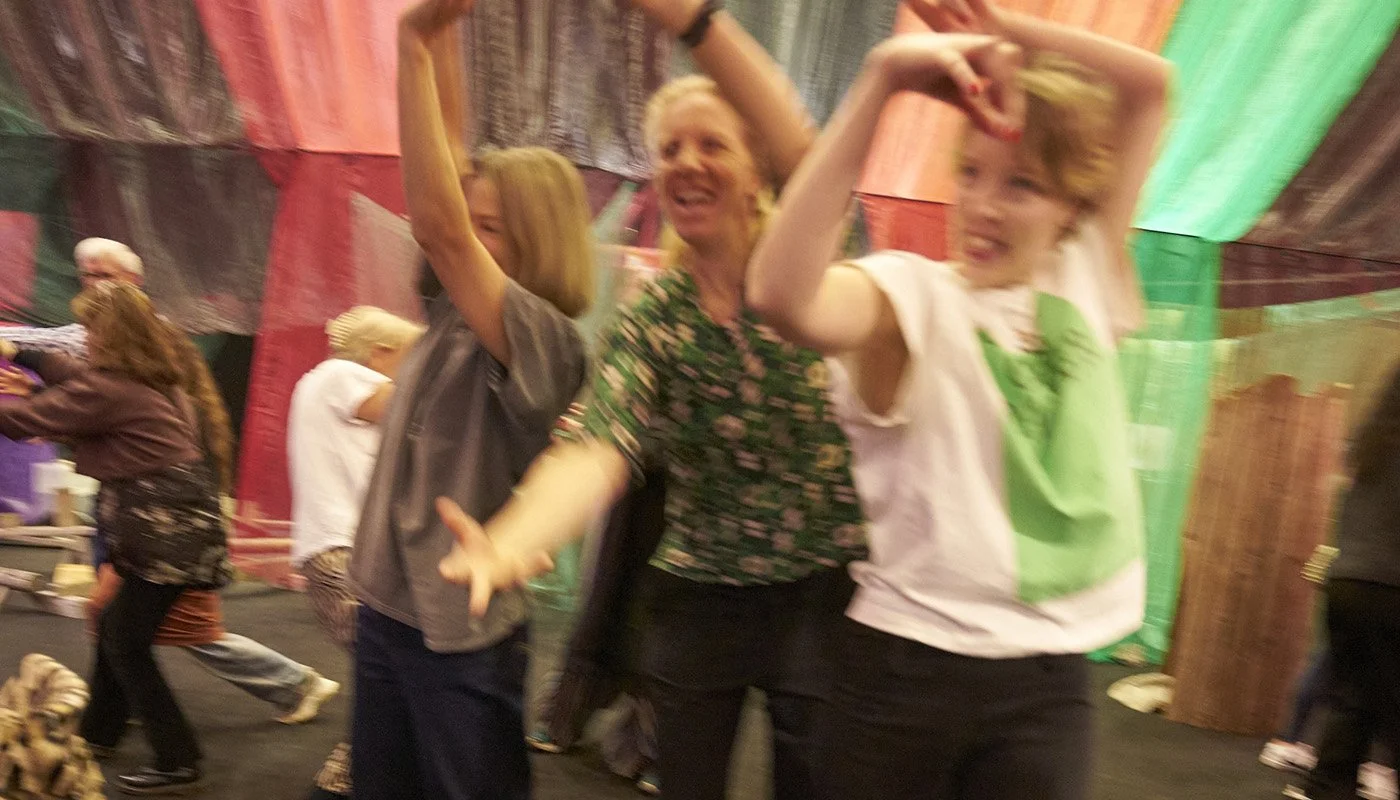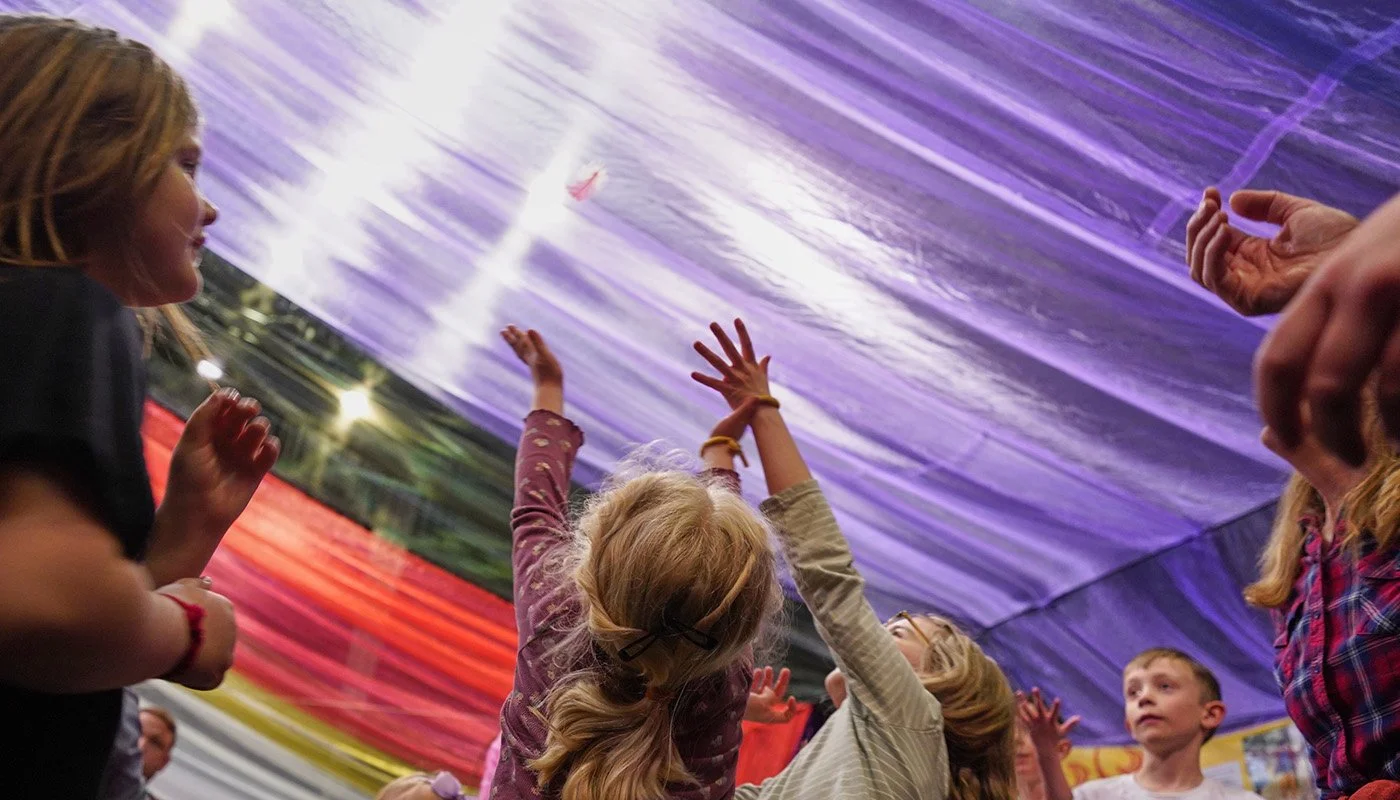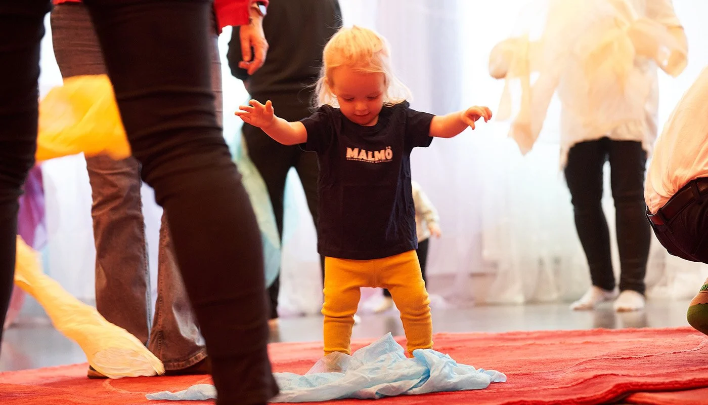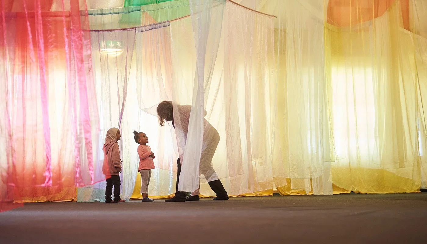 –för barn, vuxna, mor- och farföräldrar, vänner och alla som vill leka tillsammans. Under ett himmelshögt tak som skimrar i regnbågens färger möts små hus, hemliga skrymslen, slöjskogar och en skattkammare fylld av teaterkläder. Här väcks fantasin till liv genom lek, dans, sång och rörelse.