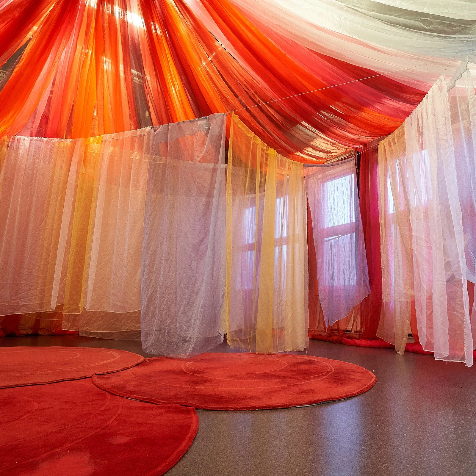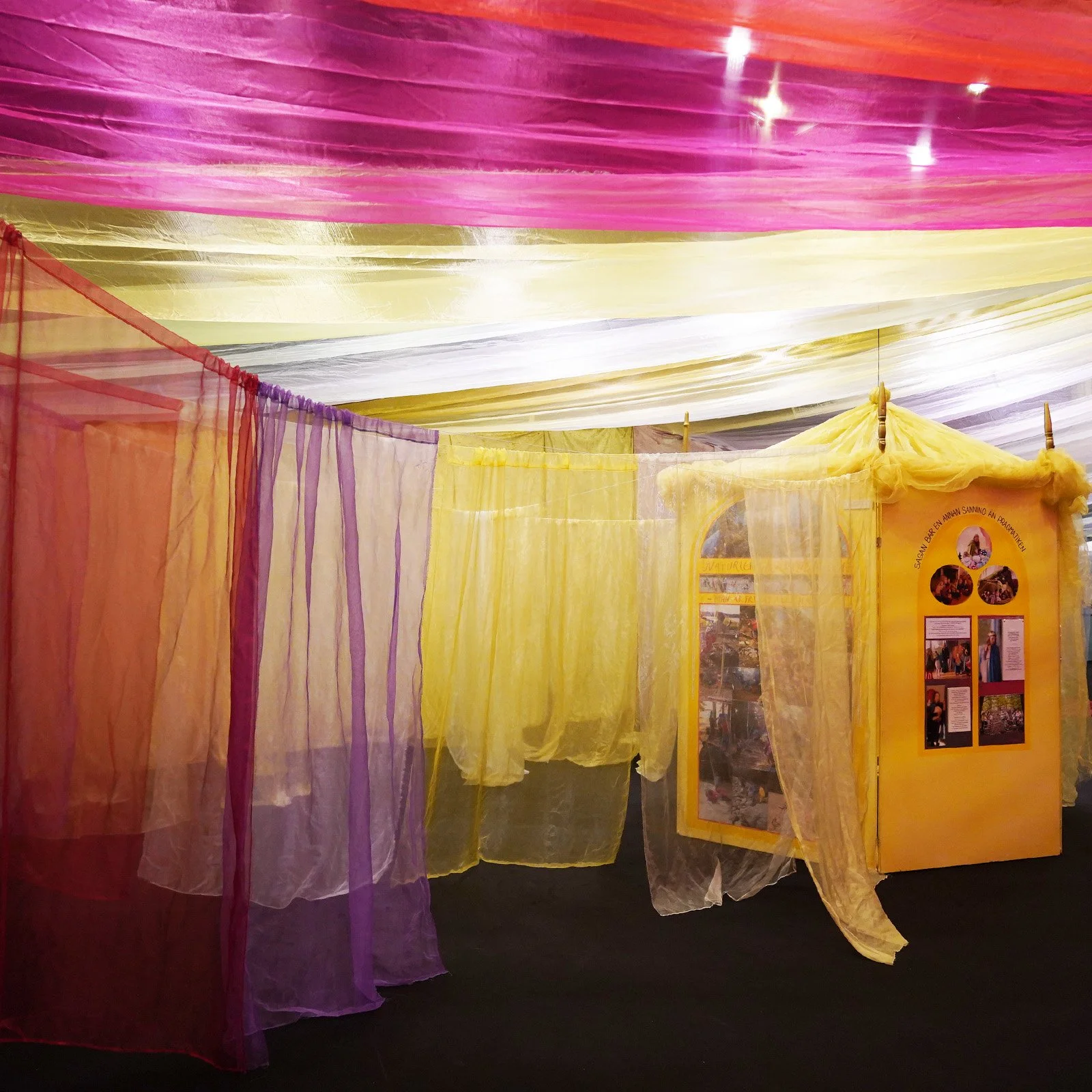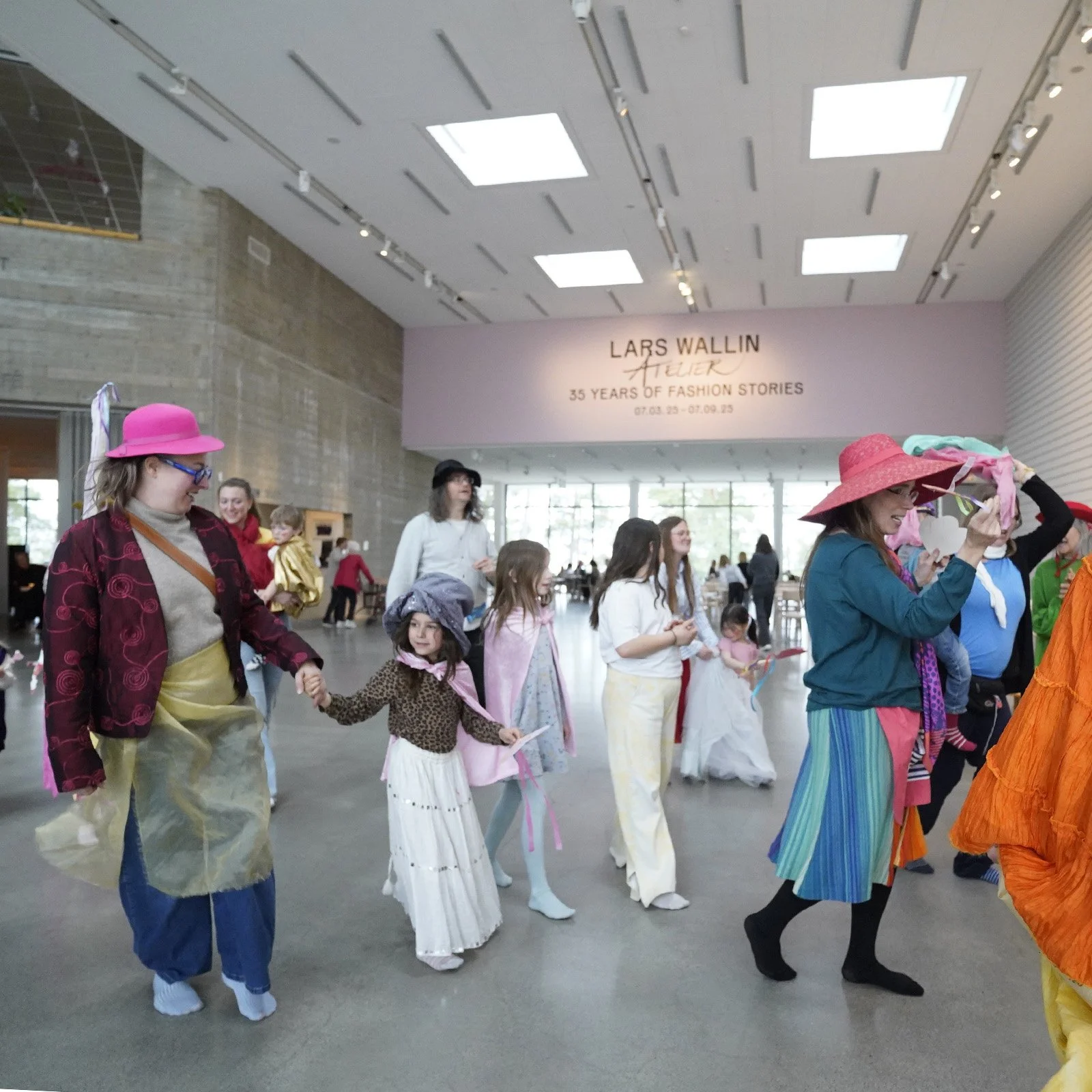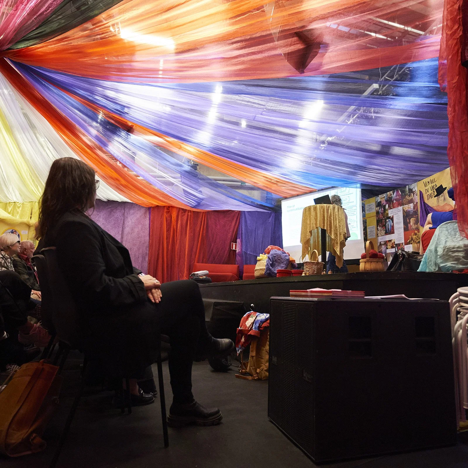 –för barn, vuxna, mor- och farföräldrar, vänner och alla som vill leka tillsammans. Under ett himmelshögt tak som skimrar i regnbågens färger möts små hus, hemliga skrymslen, slöjskogar och en skattkammare fylld av teaterkläder. Här väcks fantasin till liv genom lek, dans, sång och rörelse.